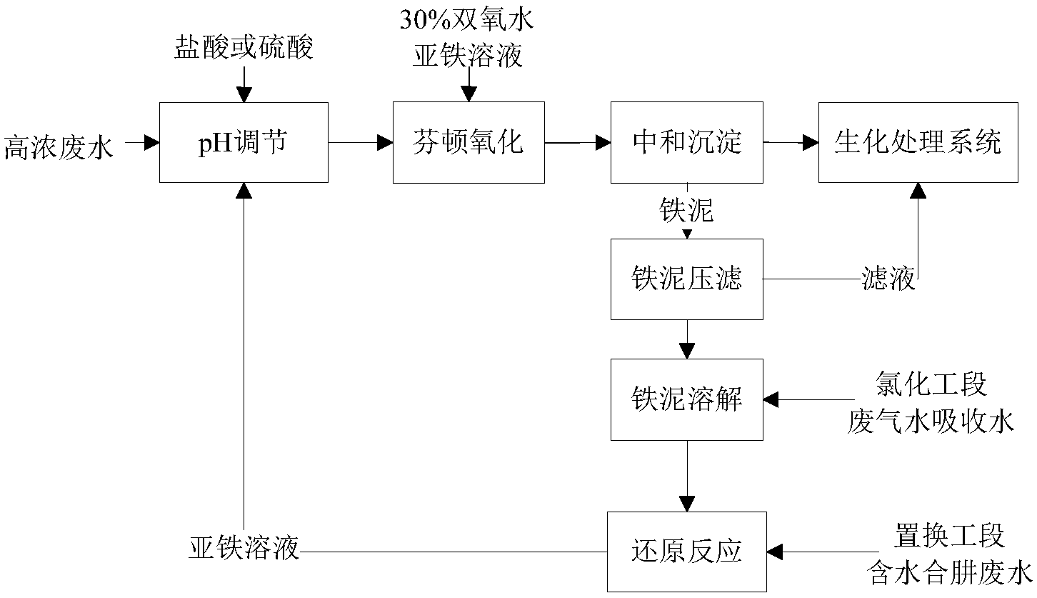 高濃度廢水經(jīng)過污水池,加入酸性原料進(jìn)行中和調(diào)解,中和后的污水加入雙氧水和亞鐵溶液,達(dá)到去除有害物質(zhì)的目的。經(jīng)過處理后的污水在經(jīng)過中和沉淀,沉淀的淤泥經(jīng)過特殊處理后外運(yùn)。具體的工藝圖如下: