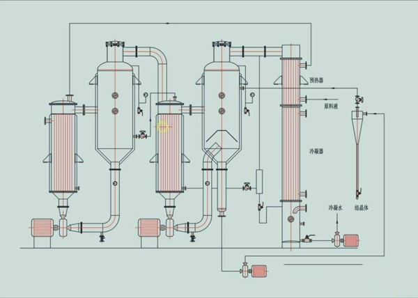 機械蒸汽再壓縮MVR蒸發器利用蒸發器中產生的二次蒸汽,經壓縮機壓縮,壓力、溫度升高,熱焓增加,然后送到蒸發器的加熱室當作加熱蒸汽使用,使料液維持沸騰狀態,而加熱蒸汽本身則將冷凝成水。這樣,原來要廢棄的蒸汽就得到了充分的利用,回收了潮熱,又提高了熱效率,生蒸汽的經濟性相當于多效蒸發的30效,減少了對外部加熱及冷卻資源的需求,降低能耗,減少污染。